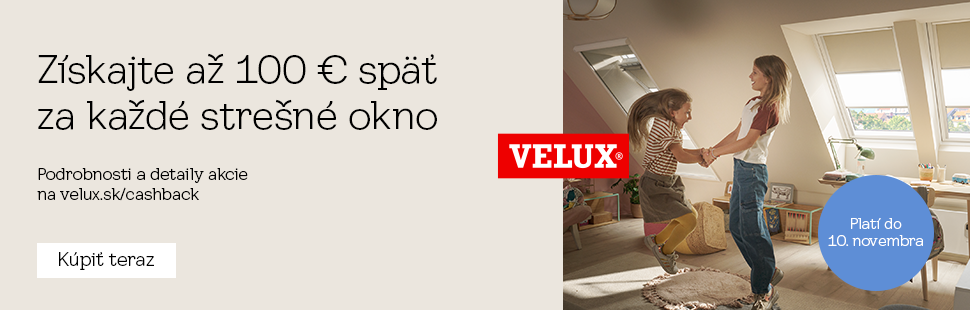 Nákupte medzi 16. septembrom až 10. novembrom 2025 u nás odporúčané strešné okná VELUX. Detaily nájdete na stránke velux.sk/cashback.